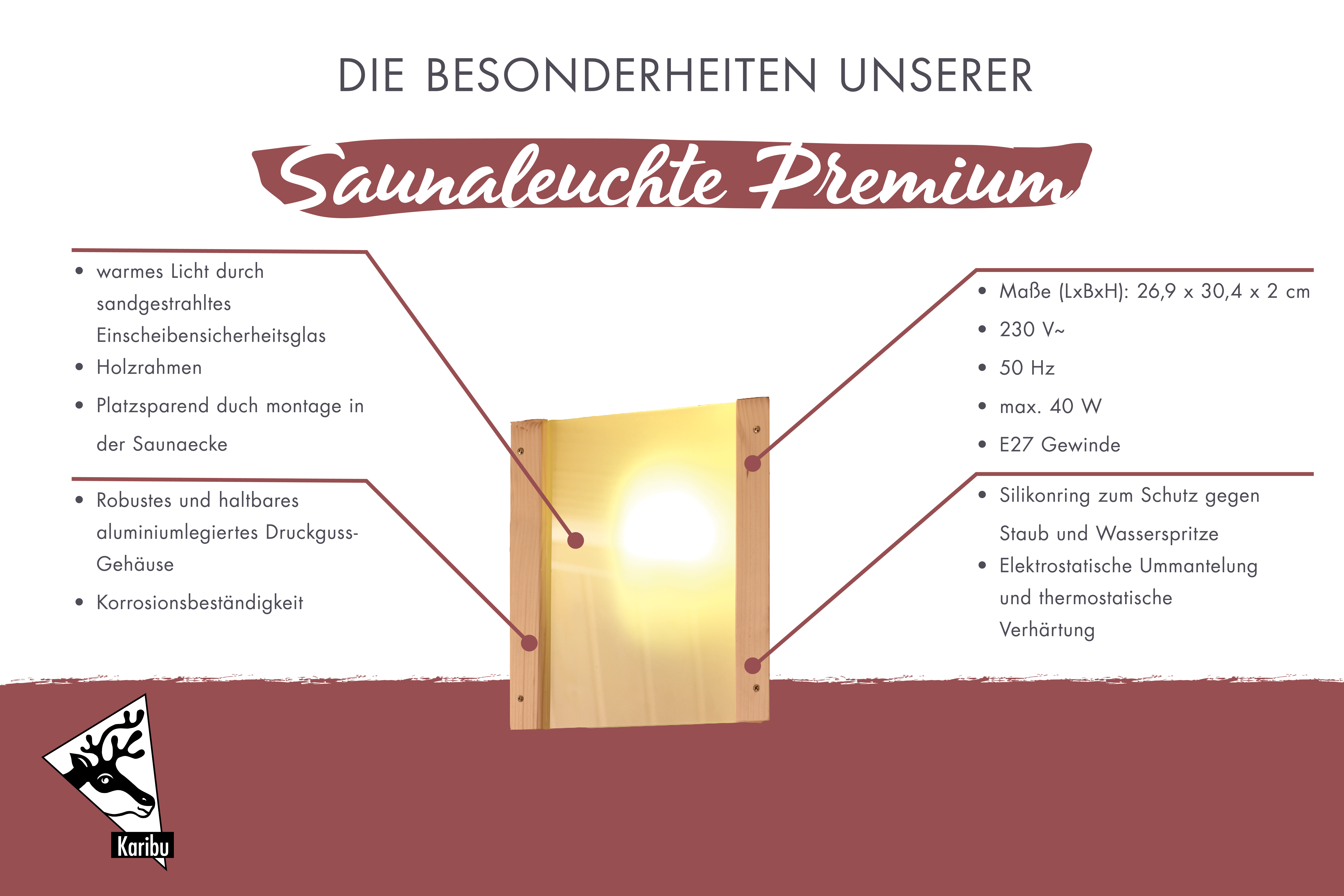 Schaffen Sie sich eine Atmosphäre der Extraklasse in Ihrer Sauna mit der Saunaleuchte Premium. Nicht nur eine schöne Ausstattung oder die Wärme in einer Sauna sorgen dafür, dass wir uns entspannen können. Auch eine angenehme Lichtquelle trägt zu einem guten Wohlbefinden bei. Hierbei sollte das Licht nicht zu hell sein, damit ein gemütliches, ruhiges Ambiente entstehen kann. Andererseits sollte das Licht aber auch nicht zu dunkel sein, um die Stimmung nicht zu trüben. Genau den Mittelweg schaffen Sie mit der Saunaleuchte Premium. Die Saunaleuchte besteht aus einem sandgestrahlten Einscheibensicherheitsglas mit Holzrahmen. Durch das sandgestrahlte Glas wird das Licht in der gesamten Saunakabine verteilt und schafft zusätzlich ein warmes Ambiente. Die Leuchte besitzt eine Größe von (LxBxH) 26,9x30,4x2 cm und passt so in jede Karibu-Sauna. Durch die Montage in der Saunaecke nimmt Sie im Raum nicht viel Platz weg. Auch bei einem aufrechten Sitzen in der Sauna ist die Saunaleuchte so kein Störfaktor. Entspannen Sie sich bei einem perfekten Lichtverhältnis mit der Saunaleuchte Premium.
