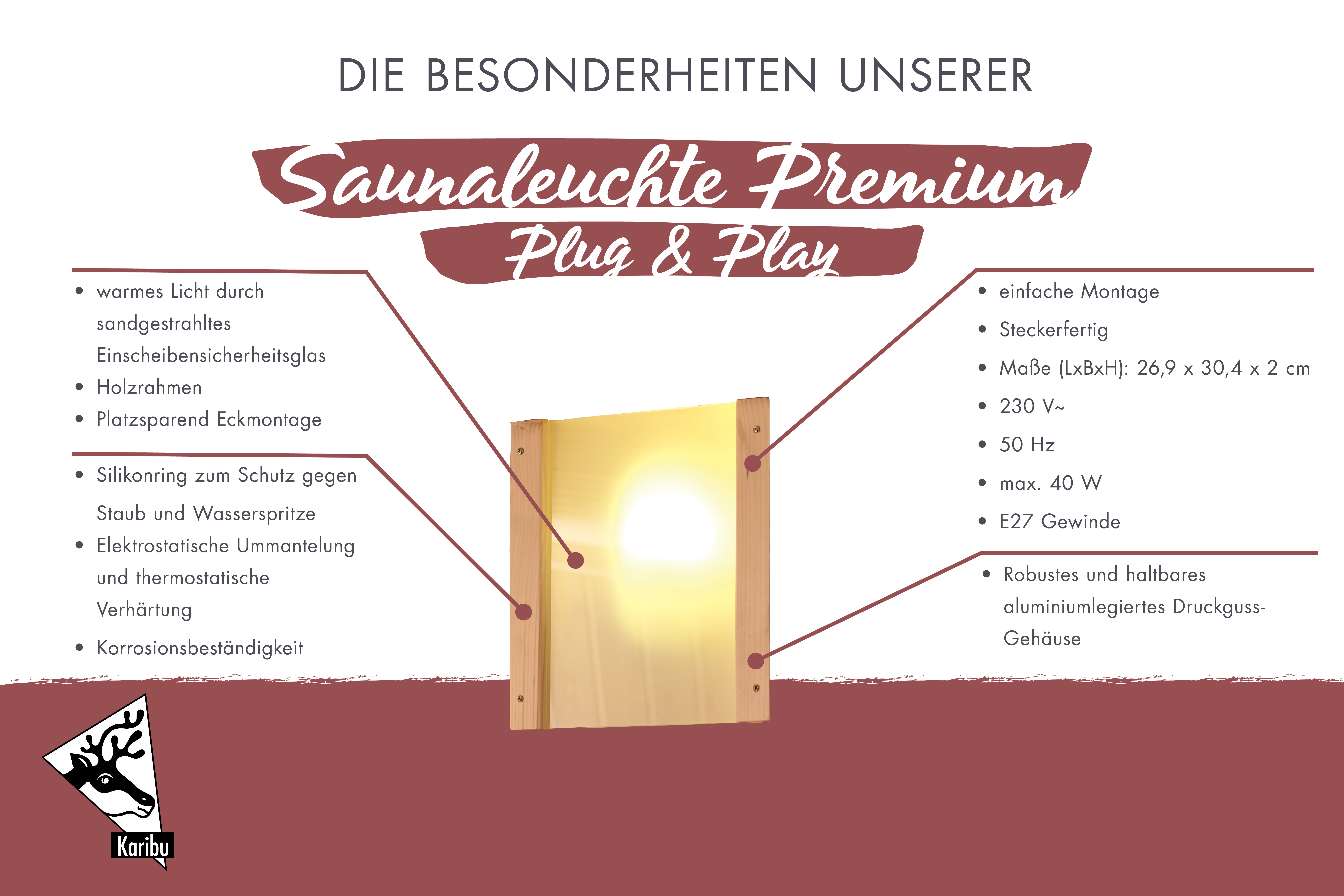 Schaffen Sie sich eine Atmosphäre der Extraklasse in Ihrer Sauna mit der Saunaleuchte Premium. Nicht nur eine schöne Ausstattung oder die Wärme in einer Sauna sorgen dafür, dass wir uns entspannen können. Auch eine angenehme Lichtquelle trägt zu einem guten Wohlbefinden bei. Hierbei sollte das Licht nicht zu hell sein, damit ein gemütliches, ruhiges Ambiente entstehen kann. Andererseits sollte das Licht aber auch nicht zu dunkel sein, um die Stimmung nicht zu trüben. Genau den Mittelweg schaffen Sie mit der Saunaleuchte Premium. Die Saunaleuchte besteht aus einem sandgestrahlten Einscheibensicherheitsglas mit Holzrahmen. Durch das sandgestrahlte Glas wird das Licht in der gesamten Saunakabine verteilt und schafft zusätzlich ein warmes Ambiente. Die Leuchte besitzt eine Größe von (LxBxH) 26,9x30,4x2 cm und passt so in jede Karibu-Sauna. Durch die Montage in der Saunaecke nimmt Sie im Raum nicht viel Platz weg. Auch bei einem aufrechten Sitzen in der Sauna ist die Saunaleuchte so kein Störfaktor. Entspannen Sie sich bei einem perfekten Lichtverhältnis mit der Saunaleuchte Premium.
