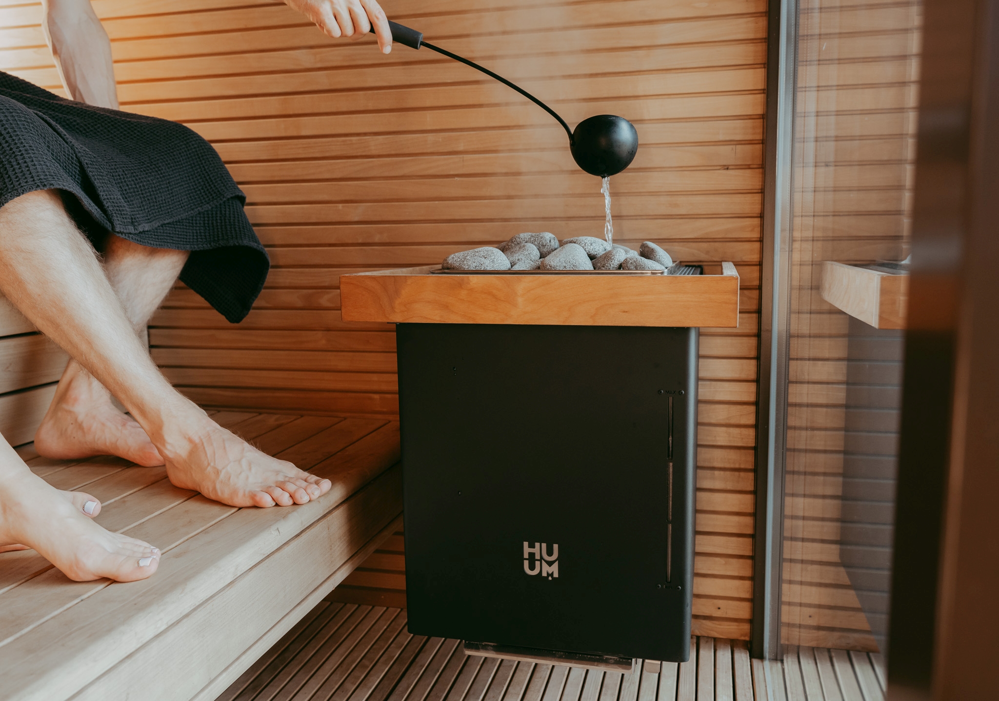 Die im Set enthaltene HUUM UKU WiFi Steuerung ermöglicht Ihnen die bequeme Bedienung Ihrer Sauna – direkt am stilvollen Steuergerät oder von unterwegs über die kostenlose HUUM App. Temperatur, Timer und Beleuchtung lassen sich ganz einfach einstellen, noch bevor Sie zu Hause sind. Die Steuerung ist dabei nicht nur komfortabel, sondern auch sicher – mit Türsensor, Kindersicherung und Überhitzungsschutz.