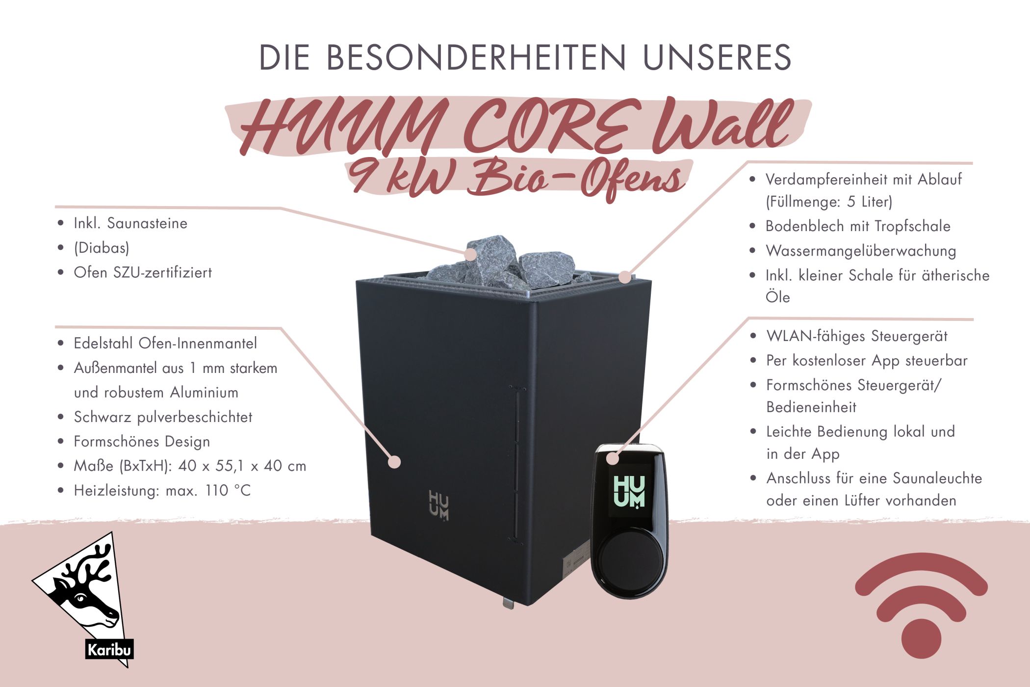 Hier angeboten wird der CORE Wall COMBI (inkl. Dampfunktion / BIO-Saunaofen) inkl. Wifi Steuergerät und Steinen (Ohne Anschlusskabel für den Ofen)