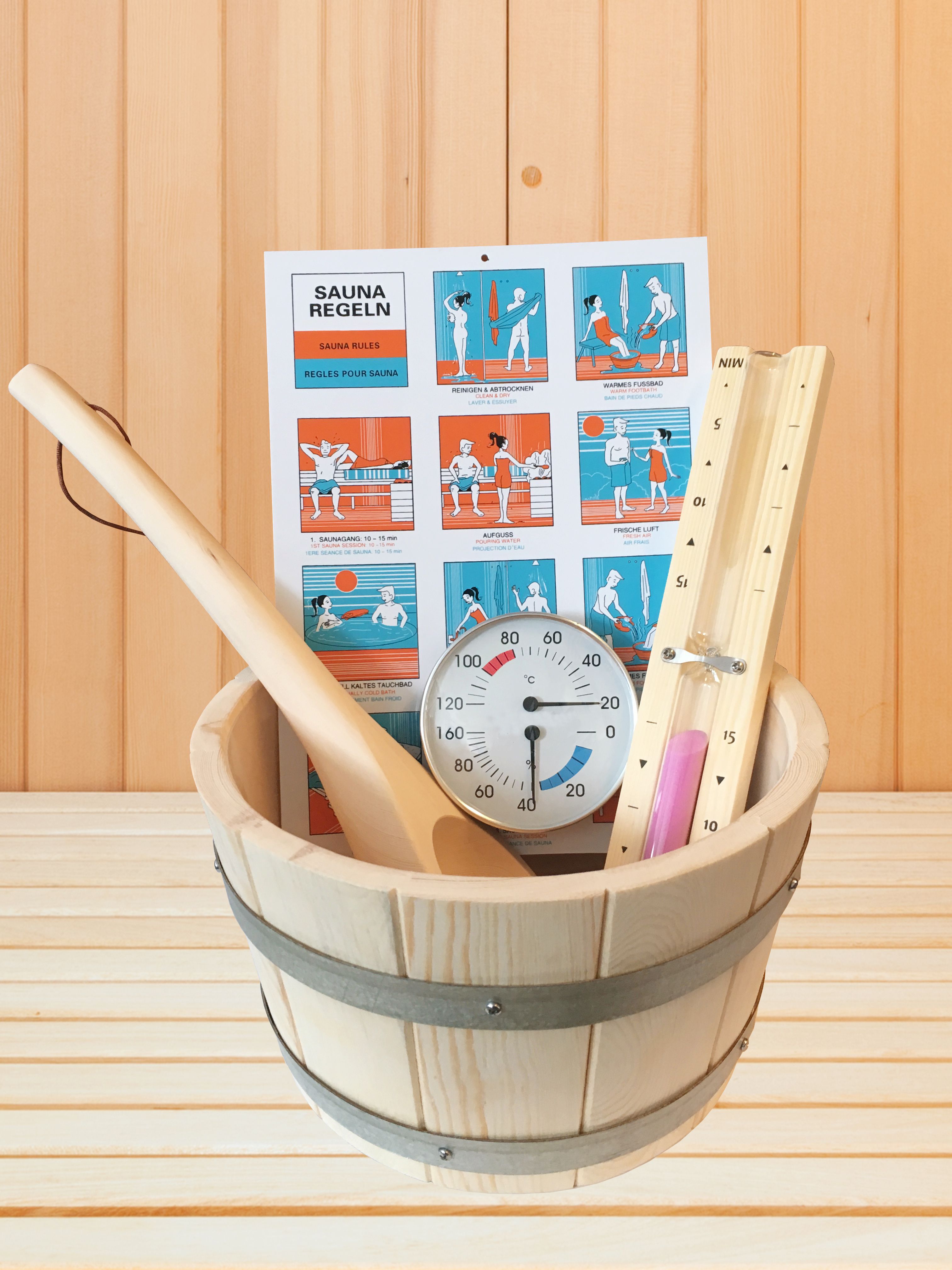 Unser Tipp für ein perfektes Saunaerlebnis ist das Zubehörpaket Classic. Dieses enthält alle wichtigen Accessoires, die Sie für einen Saunagang benötigen. Vor dem Saunieren sollten Sie sich über alle Vorschriften und Regeln, welche in einer Sauna und während des Ofenbetriebes zu beachten sind. Hier hilft Ihnen unsere Sauna-Baderegeltafel weiter. Auf dieser sind alle wichtigen Regeln und Verhaltensweisen für einen perfekten Saunagang, sowohl bildlich als auch schriftlich, dargestellt. Damit Sie die Temperatur jederzeit im Blick haben, beinhalten das Set einen Klimamesser. Dieser hat einen Durchmesser von 10 cm, ein Metallgehäuse und einen verchromten Rahmen. Eine Sanduhr zeigt Ihnen die bereits verstrichene Zeit an. Ist der Sand durchgelaufen, sind die 15 Minuten in der Sauna vorbei und die Abkühlphase kann beginnen. Natürlich darf der typische Löyly, der finnische Saunaaufguss nicht fehlen. Hierfür sind im Set ein Aufgusskübel aus Fichtenholz und ein Kunststoffeinsatz enthalten. Mit dem Zubehörpaket Classic steht dem perfekten Saunaerlebnis nichts mehr im Wege.