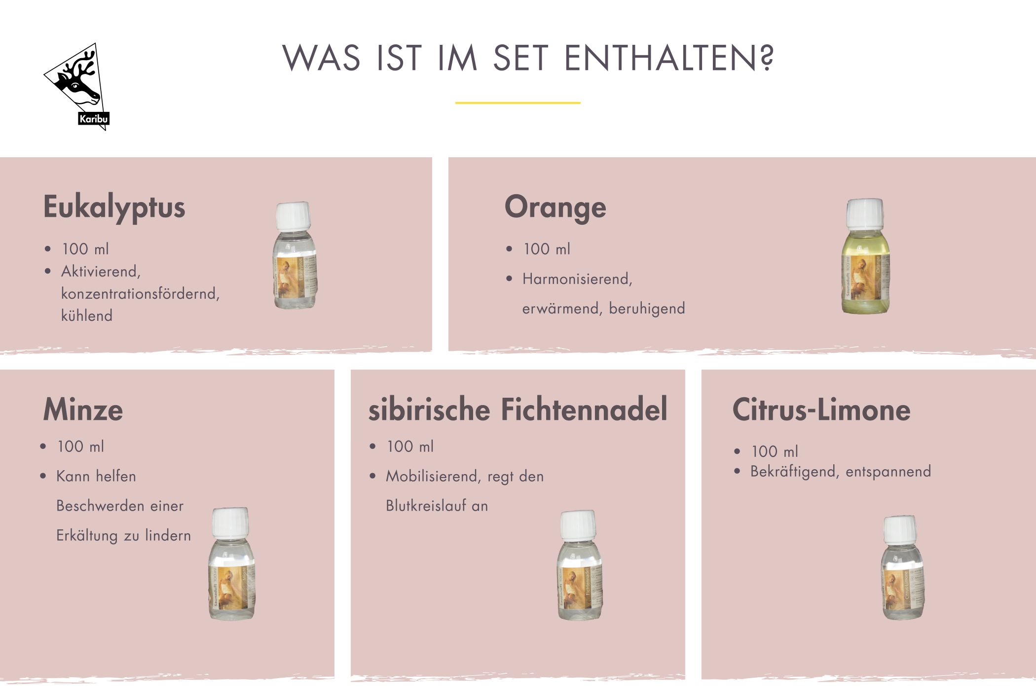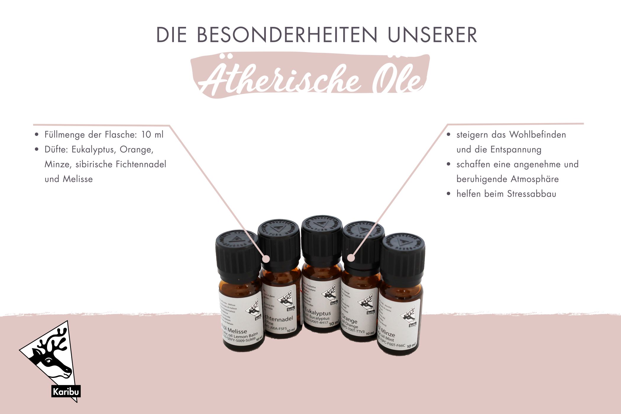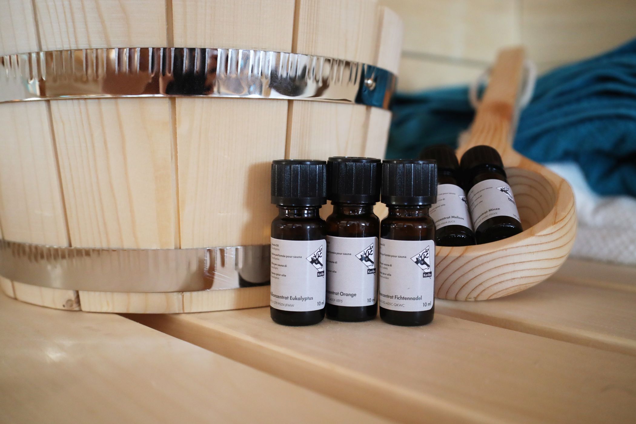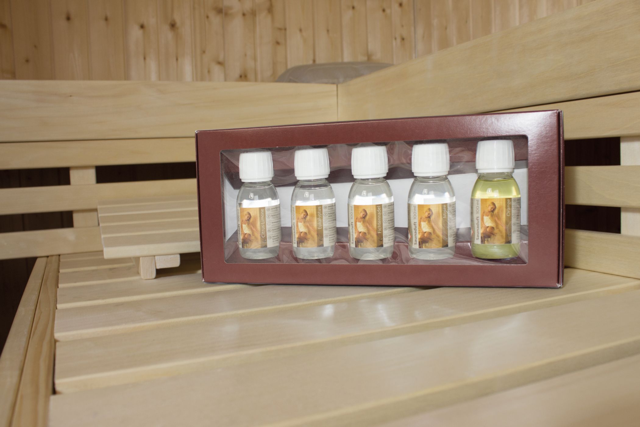 Zusätzlich können Sie mit den ätherischen Ölen, wie Eukalyptus, Orange, Minze, Fichtennadel sibirisch und Melisse, Ihrem Saunaaufguss einen angenehmen Duft verleihen und Ihre Sinne verwöhnen.