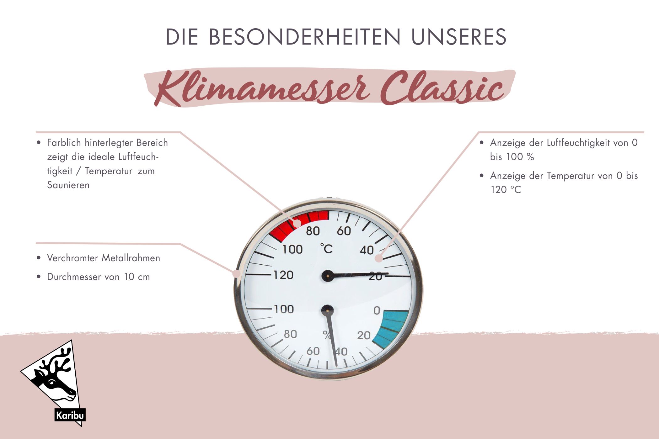 Der Klimamesser ermöglicht es Ihnen, die optimale Temperatur und Luftfeuchtigkeit in Ihrer Sauna zu überwachen und anzupassen.