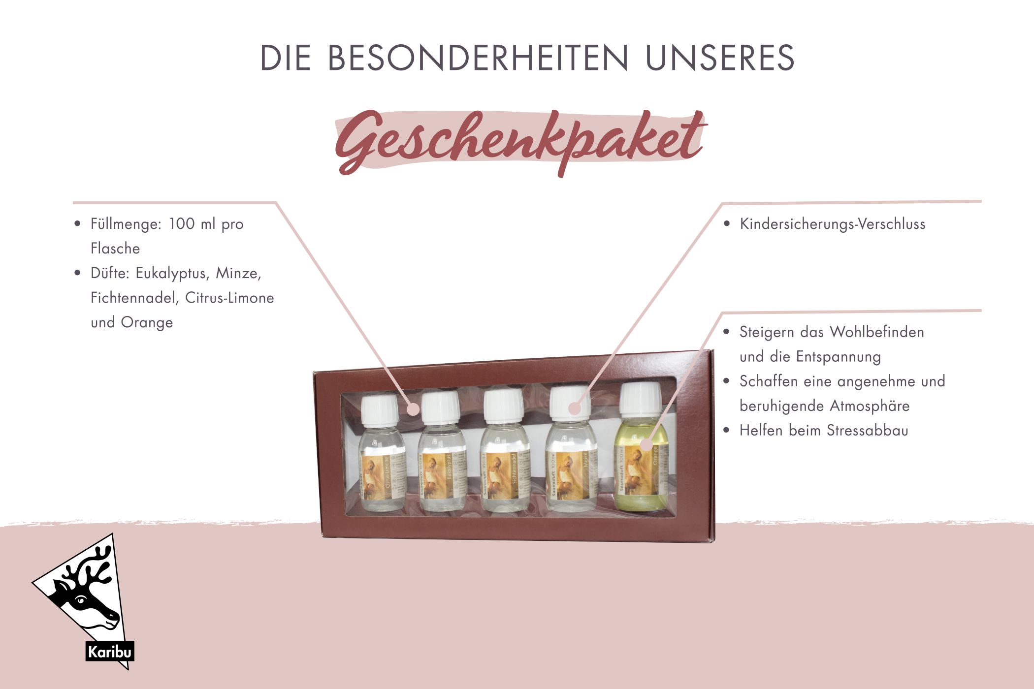 Möchten Sie Ihren Liebsten etwas Gutes für Körper, Geist und Seele tun und Sie einmal so richtig verwöhnen? Dann ist das Duft-Geschenkpaket genau das Richtige. Die fünf Düfte mit je 100ml Saunaaufguss-Konzentrat lassen keine Wünsche offen. Beleben Sie die Sinne und schicken Sie sie auf eine Reise der Entspannung: