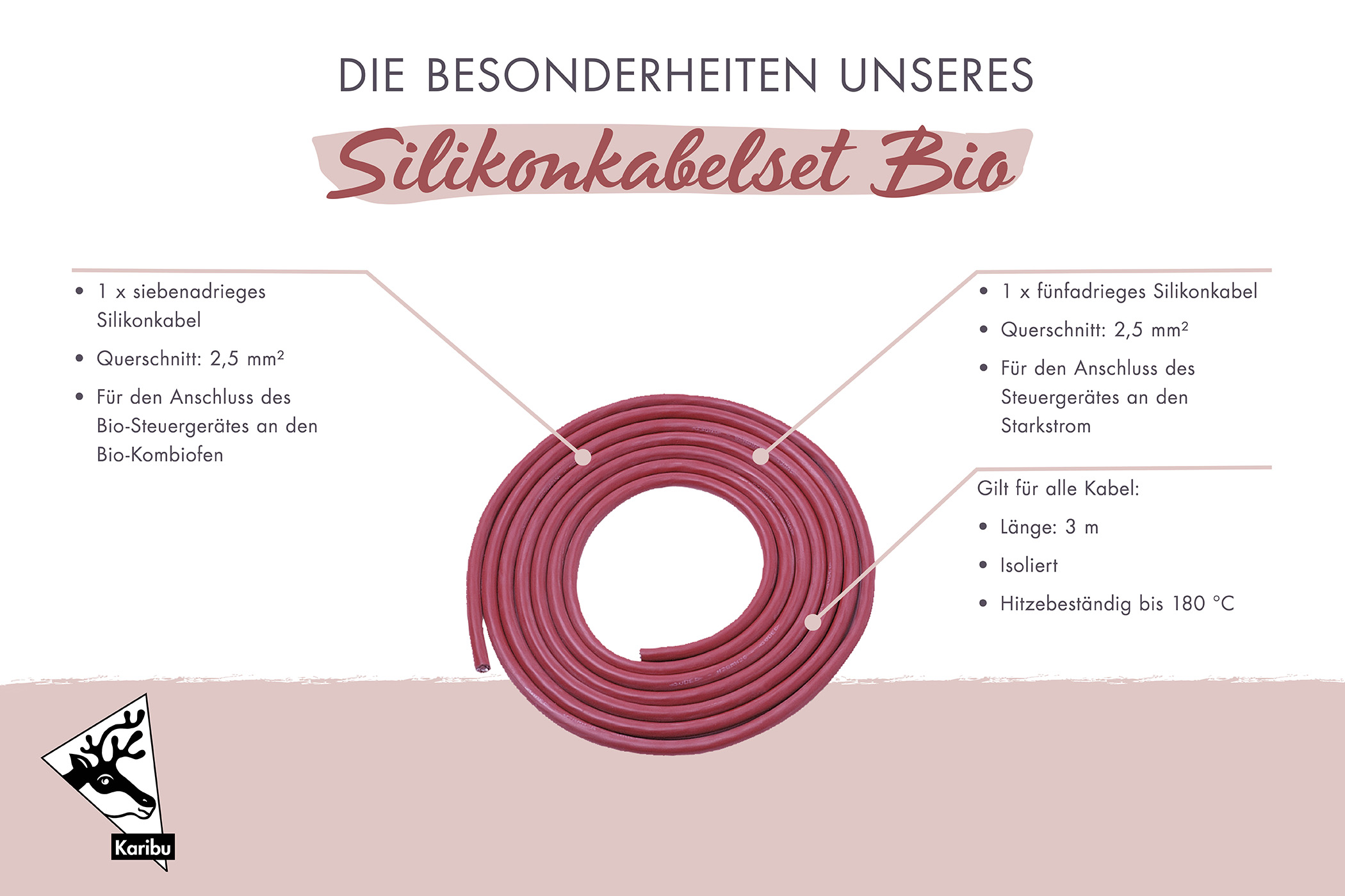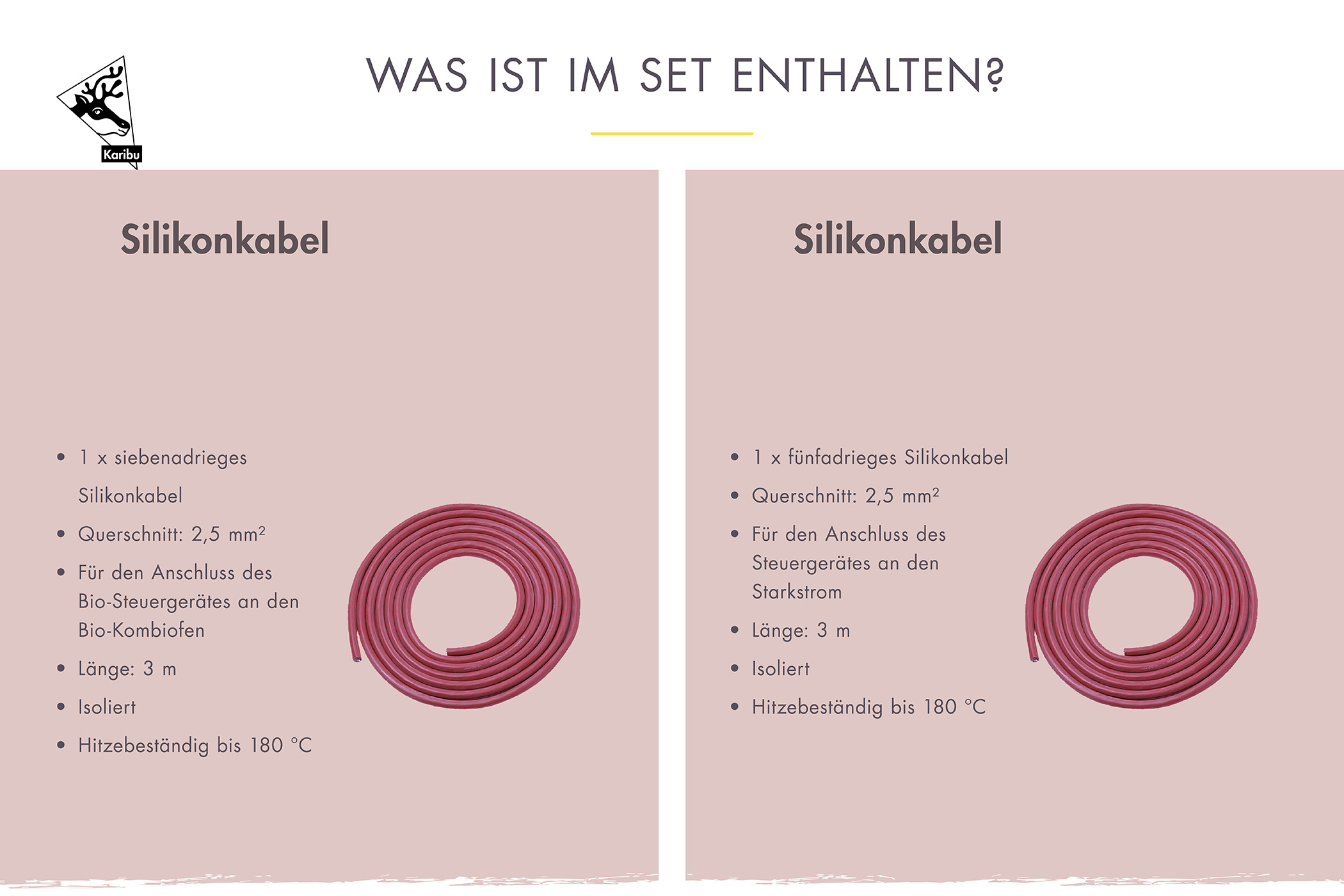 - Das Silikonkabelset für den finnischen Saunaofen beinhaltet: 2x fünfadriges Silikonkabel (2,5mm²)