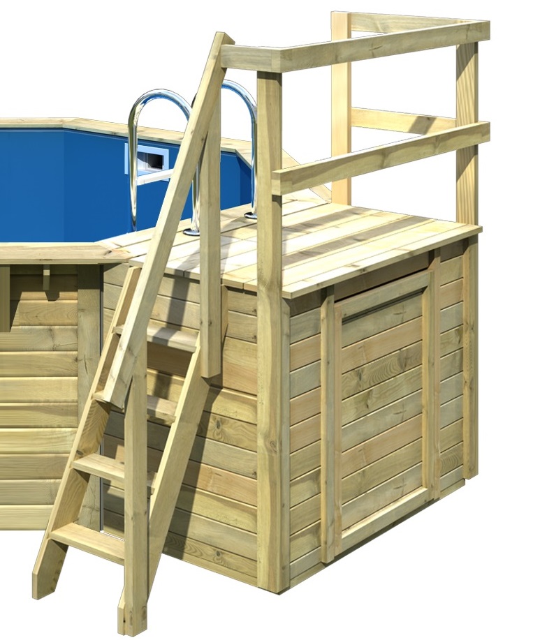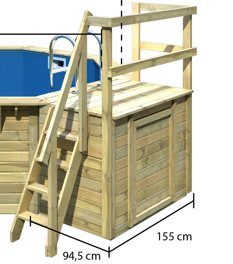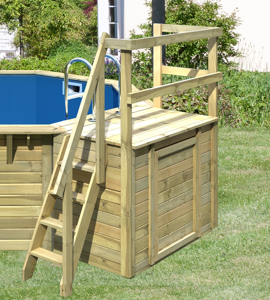 Ihr Pool steht aufgebaut an seinem gewünschten Platz, der Garten blüht und das Ambiente ist geschaffen. Jetzt stört nur noch die freie Sicht auf die benötigte Pooltechnik. Für dieses Problem bieten wir die passende Lösung. Mit der Sonnenterrasse schaffen Sie im Nu den optimalen Stauraum für Ihre Pooltechnik und zusätzlich einen optisch ansprechenden Einstieg in Ihren Karibu Pool. Die Terrasse besteht aus kesseldruckimprägniertem, nordischem Fichtenholz und wird im einfachen Steck- und Schraubsystem montiert. Das 28mm starke Rundprofil mit Nut und Feder sorgt für die nötige Stabilität. Verschlossen wird die Sonnenterrasse mithilfe einer vormontierten, (BxT) 98 x89 cm großen Einflügeltür, welche ebenfalls aus Holz besteht. Gehalten wird die Tür von justierbaren Türbändern für eine optimale Ausrichtung. Durch eine Sicherheitsüberfalle wird die Technik im Inneren geschützt.