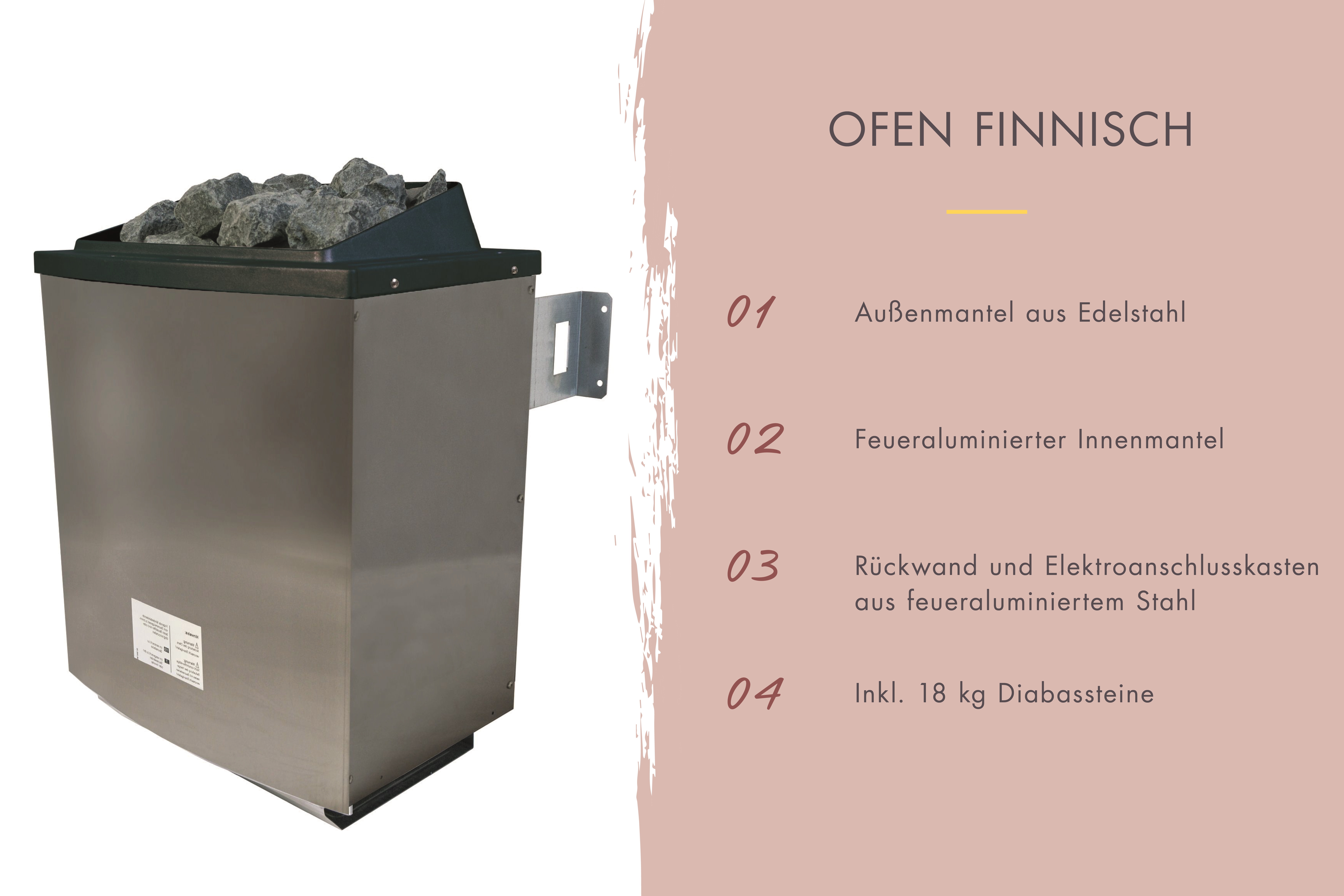 - Leistung: 4,5 kW – ideal für kleine Saunakabinen (Starkstromanschluss erforderlich)
