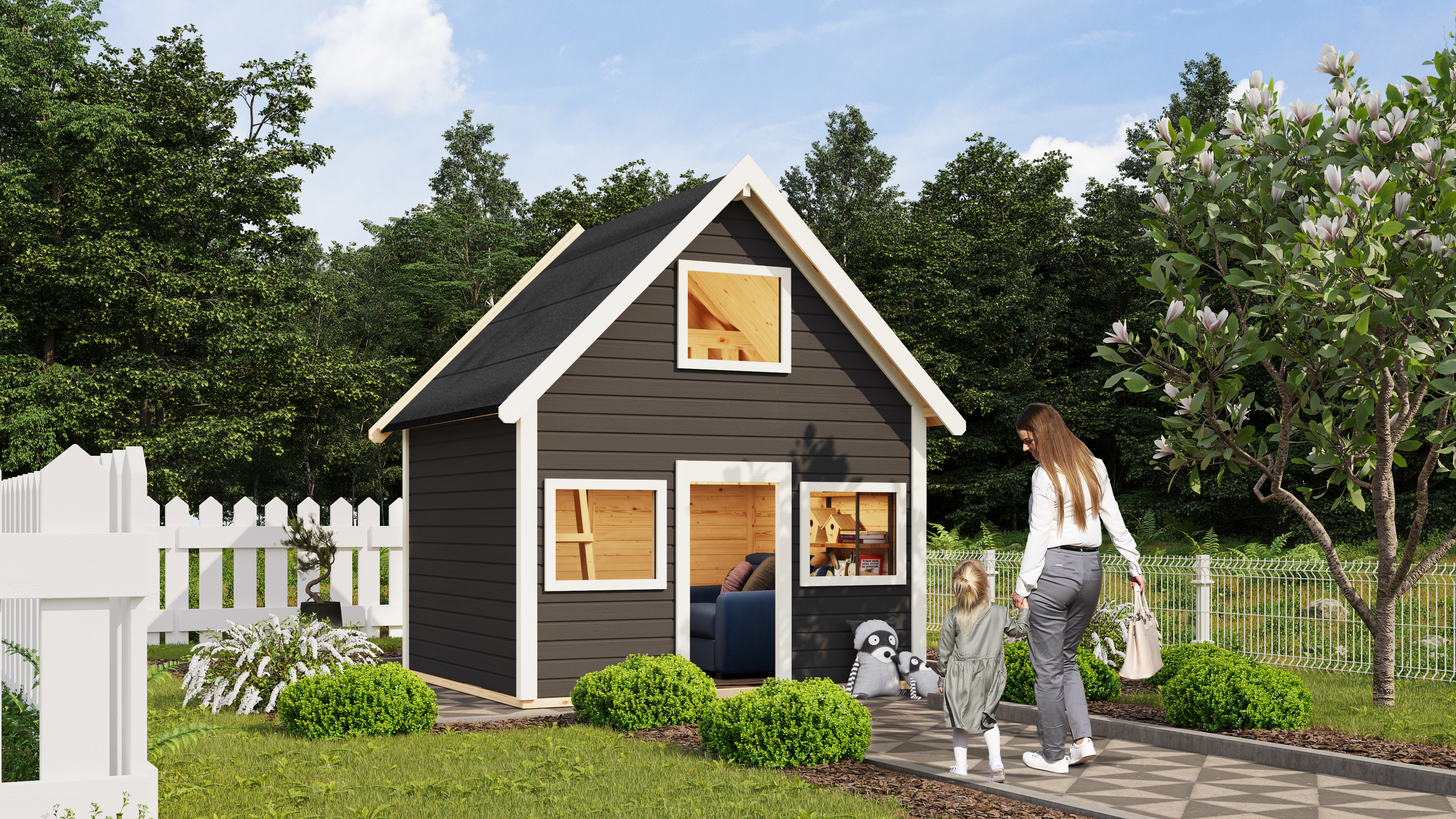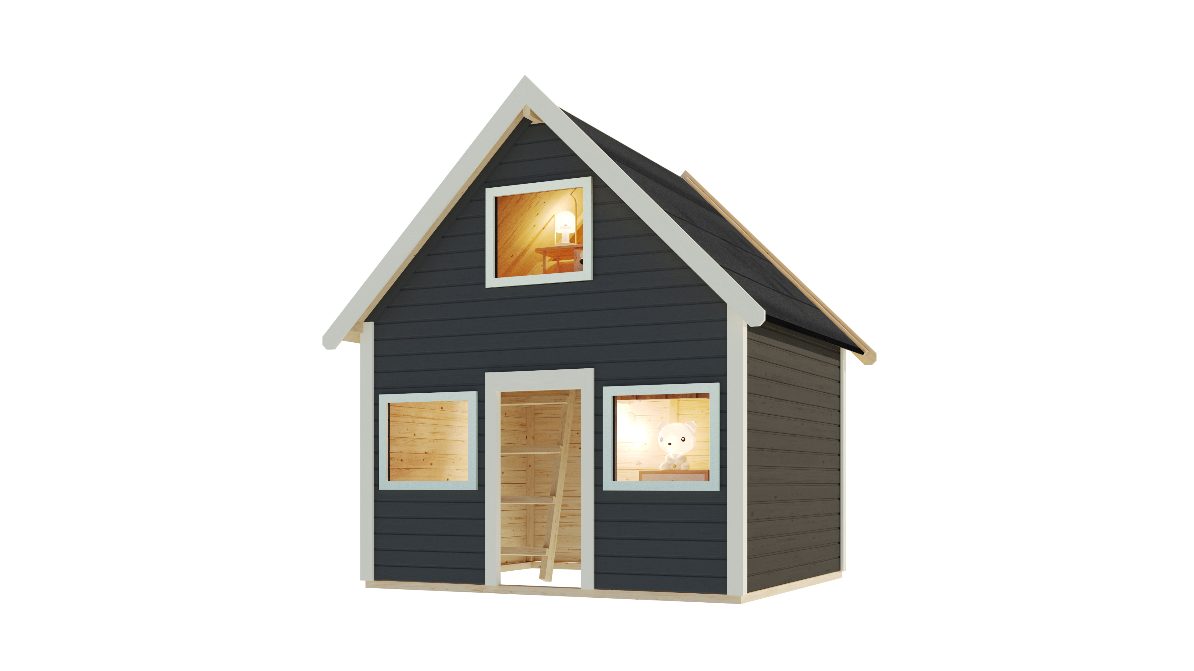 Unser qualitativ hochwertiges Spielhaus hat eine Wandstärke von 19 mm und wird auf die inklusiven KDI- (kesseldruckimprägnierten) Unterleger aufgebaut. Nordische Fichte, kommend aus dem hohen Norden Europas, ist der Rohstoff aus dem wir unser Spielhaus herstellen. Das formschöne und praktische Satteldach aus Holzplatten sorgt bei jedem Wetter für den Schutz, den Ihre Kinder brauchen. Die Seitenwand ist 141 cm hoch, bis zur Spitze des Daches gemessen sind es 253 cm. Den Zutritt verschaffen sich Ihre kleinen Großen über den Türausschnitt mit einem Maß von 47,5 cm x 97,5 cm. Die Besonderheit unseres Spielhauses Kalle besteht in der zusätzlichen Ebene, welche es Ihren Kindern ermöglicht, auf 2 Etagen zu spielen.
