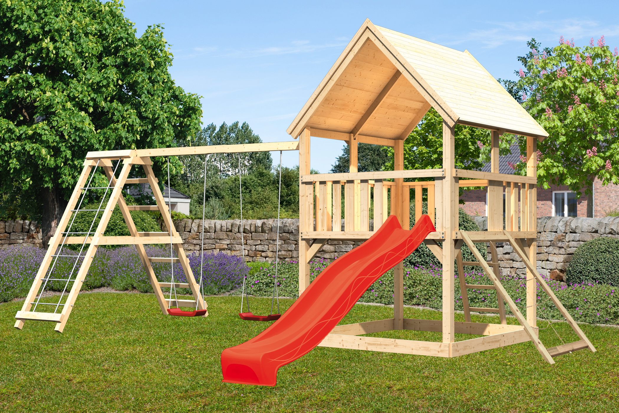 Unser Spielturm Luis lässt sich ganz individuell zusammenstellen. Mit Anbau oder Netzrampe? Vielleicht ja auch beides! Eine Schaukel? Ein Klettergerüst wäre doch auch schön. Und dazu noch eine 250 cm lange Rutsche? Eine rote oder blaue? Entdecke unsere vielseitigen Möglichkeiten und zaubere dir einen echten Hingucker in den Garten.