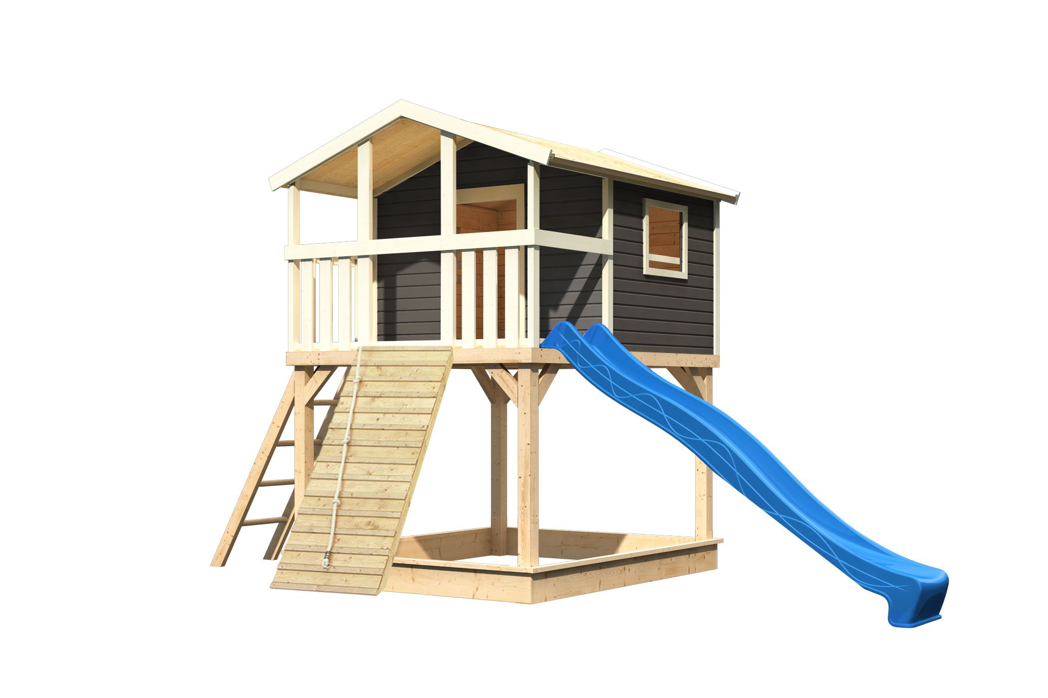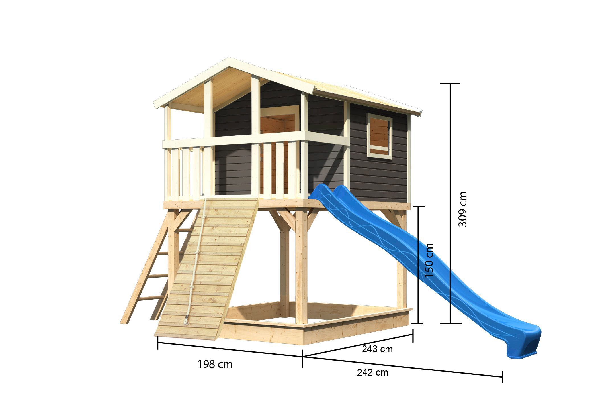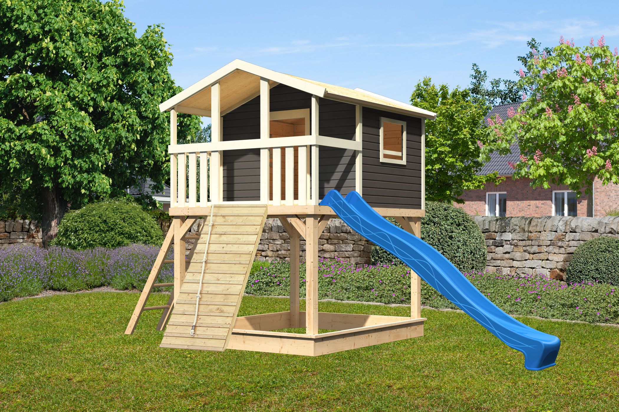 Dieses Stelzenhaus von Akubi & Karibu aus 19 mm starken Wandbrettern mit einer Podesthöhe von 150 cm beflügelt die Fantasie Ihrer Kinder. 4 Massivholzpfosten mit einer Stärke von 90 mm x 90 mm und Terrassen vor dem Haus mit Brüstung sorgen für viel Sicherheit für Ihre Kleinen. Im Lieferumfang ist eine Holzleiter enthalten, die den Zugang zur Terrasse vereinfacht, sowie ein integrierter Sandkasten für kreativen Spielspaß. Das Außenmaß dieses Hauses beträgt 198 cm x 244 cm x 309 cm und bietet somit unglaublich viel Platz um die Fantasie anzukurbeln. Das Haus wird mit einem Satteldach aus Massivholz geschützt. Die 6 m² große Dachfläche bietet auch der Terrasse noch Schutz und sorgt für unbeschwertes Spielvergnügen, egal zu welcher Jahreszeit. Unsere Stelzenhäuser bieten mit einer Rutsche in drei Farben sowie weiterem umfangreichem Zubehör alles, was das Kinderherz begehrt.