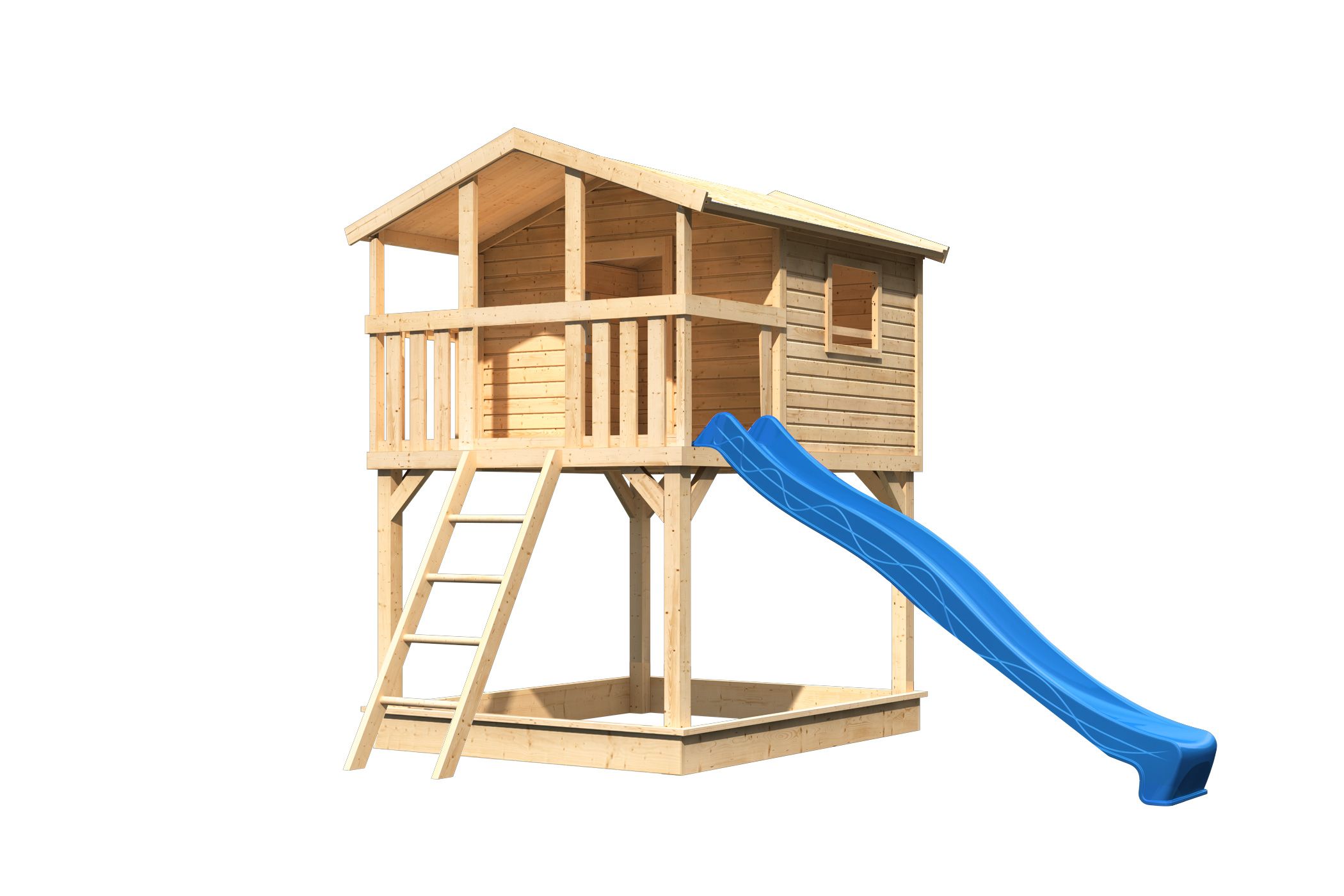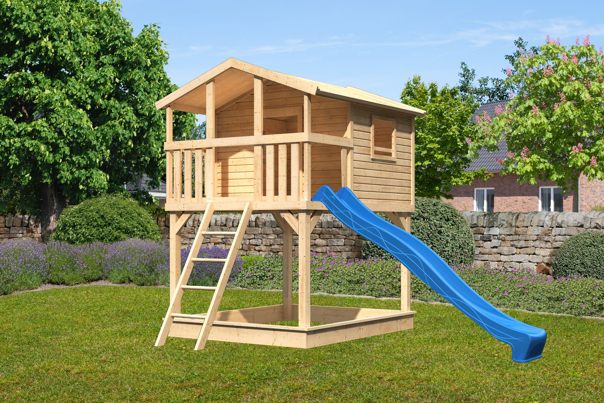 Dieses Stelzenhaus von Akubi & Karibu aus 19 mm starken Wandbrettern mit einer Podesthöhe von 150 cm beflügelt die Fantasie Ihrer Kinder. 4 Massivholzpfosten mit einer Stärke von 90 mm x 90 mm und Terrassen vor dem Haus mit Brüstung sorgen für viel Sicherheit für Ihre Kleinen. Im Lieferumfang ist eine Holzleiter enthalten, die den Zugang zur Terrasse vereinfacht, sowie ein integrierter Sandkasten für kreativen Spielspaß. Das Außenmaß dieses Hauses beträgt 198 cm x 244 cm x 309 cm und bietet somit unglaublich viel Platz um die Fantasie anzukurbeln. Das Haus wird mit einem Satteldach aus Massivholz geschützt. Die 6 m² große Dachfläche bietet auch der Terrasse noch Schutz und sorgt für unbeschwertes Spielvergnügen, egal zu welcher Jahreszeit. Unsere Stelzenhäuser bieten mit einer Rutsche in drei Farben sowie weiterem umfangreichem Zubehör alles, was das Kinderherz begehrt.