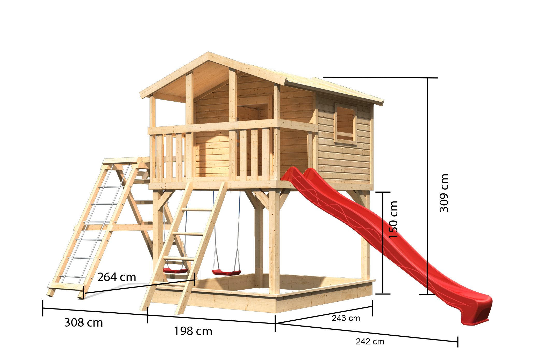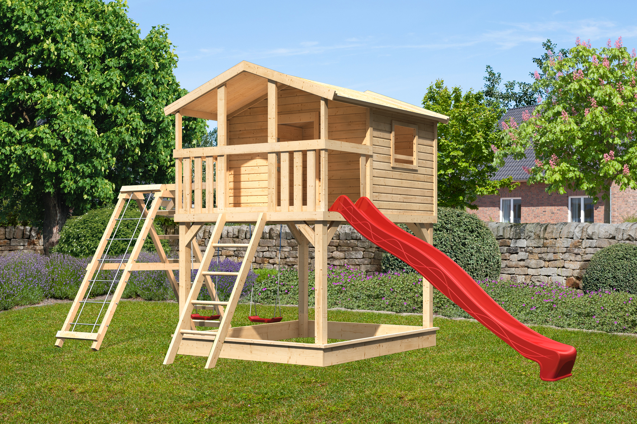 Dieses Stelzenhaus von Akubi & Karibu aus 19 mm starken Wandbrettern mit einer Podesthöhe von 150 cm beflügelt die Fantasie Ihrer Kinder. 4 Massivholzpfosten mit einer Stärke von 90 mm x 90 mm und Terrassen vor dem Haus mit Brüstung sorgen für viel Sicherheit für Ihre Kleinen. Im Lieferumfang ist eine Holzleiter enthalten, die den Zugang zur Terrasse vereinfacht, sowie ein integrierter Sandkasten für kreativen Spielspaß. Das Außenmaß dieses Hauses beträgt 198 cm x 244 cm x 309 cm und bietet somit unglaublich viel Platz um die Fantasie anzukurbeln. Das Haus wird mit einem Satteldach aus Massivholz geschützt. Die 6 m² große Dachfläche bietet auch der Terrasse noch Schutz und sorgt für unbeschwertes Spielvergnügen, egal zu welcher Jahreszeit. Unsere Stelzenhäuser bieten mit einer Rutsche in drei Farben sowie weiterem umfangreichem Zubehör alles, was das Kinderherz begehrt.