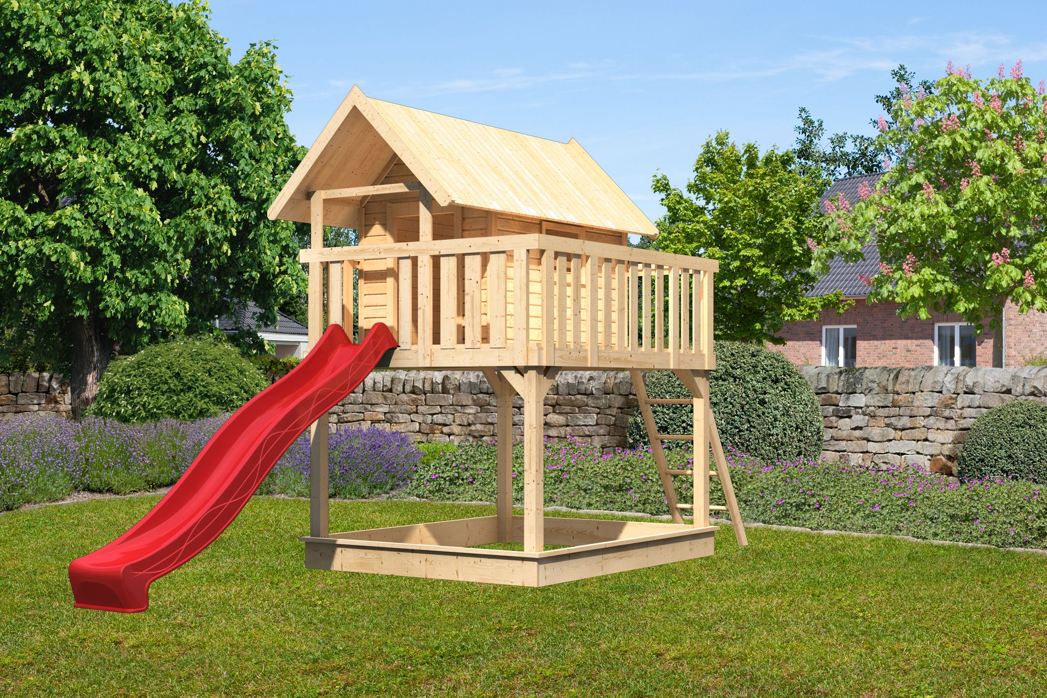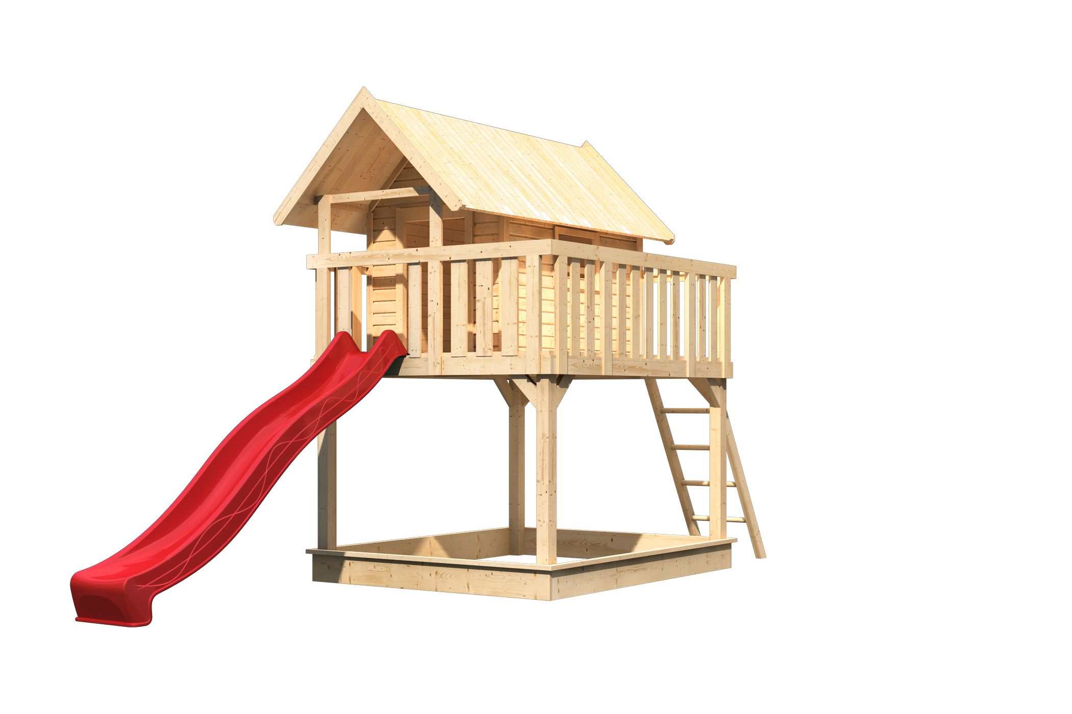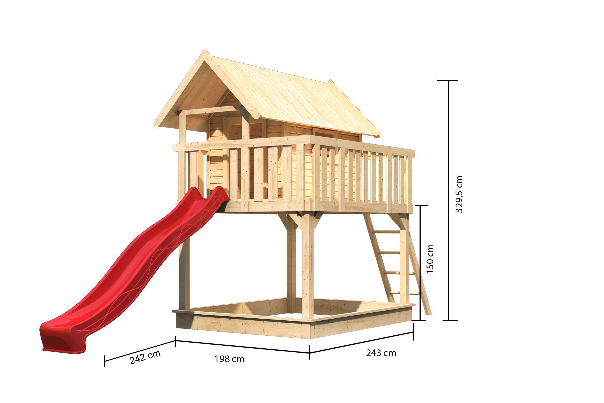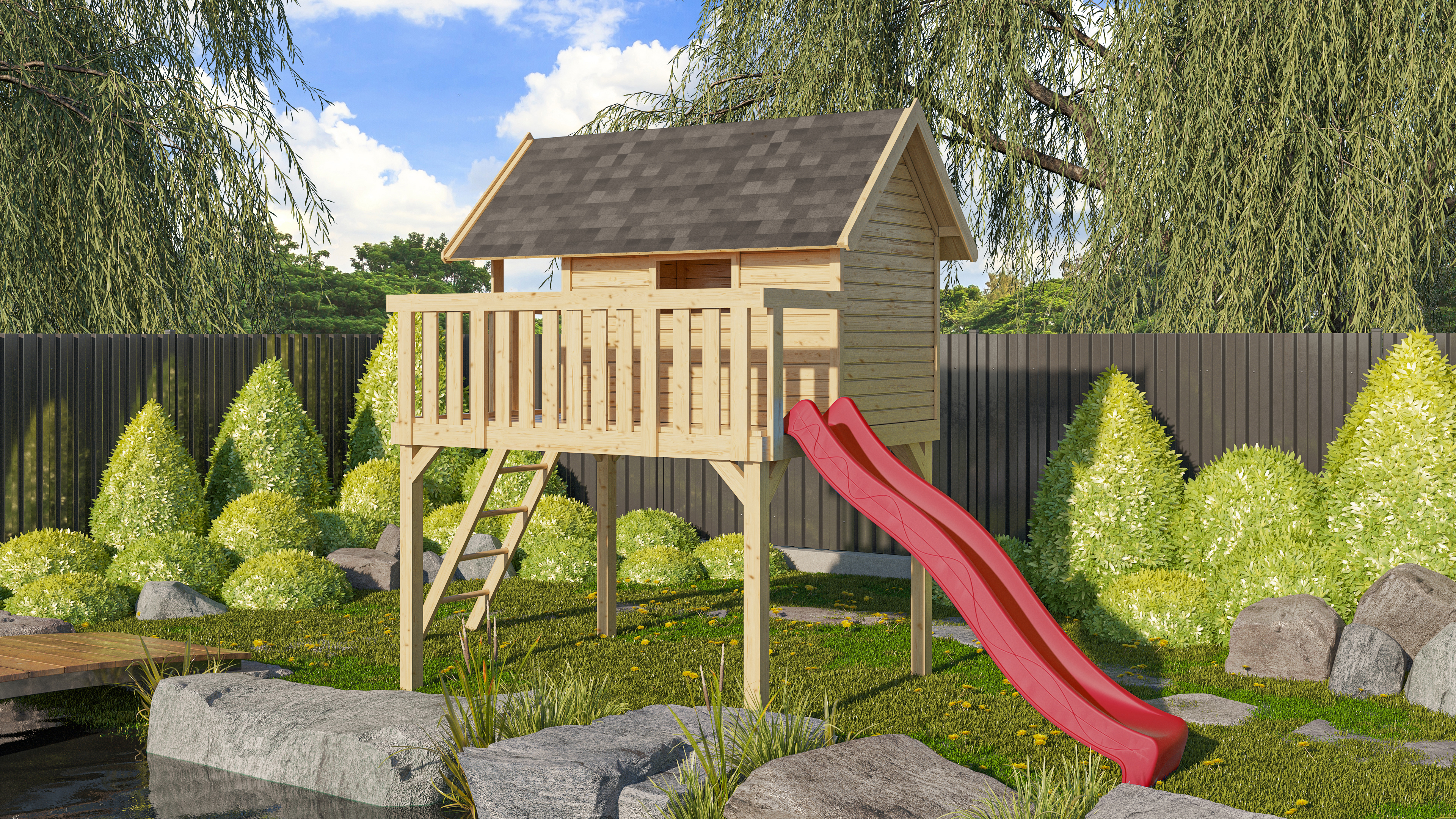 Dieses Stelzenhaus aus 19 mm starken Wandbrettern mit einer Podesthöhe von 150 cm beflügelt die Fantasie Ihrer Kinder. 4 Massivholzpfosten mit einer Stärke von 90 mm x 90 mm und Terrassen vor dem Haus mit Brüstung sorgen für viel Sicherheit für Ihre Kleinen. Im Lieferumfang ist eine Holzleiter enthalten, die den Zugang zur Terrasse vereinfacht. Das Außenmaß dieses Hauses beträgt 198 cm x 243 cm x 329,5 cm und bietet somit unglaublich viel Platz um die Fantasie anzukurbeln. Das Haus wird mit einem Satteldach aus Massivholz geschützt. Die 5,9 m² große Dachfläche bietet auch der Terrasse noch Schutz und sorgt für unbeschwertes Spielvergnügen, egal zu welcher Jahreszeit. Unsere Stelzenhäuser bieten mit einer 300 cm langen Rutsche in vielen Farben sowie weiterem umfangreichem Zubehör alles, was das Kinderherz begehrt.