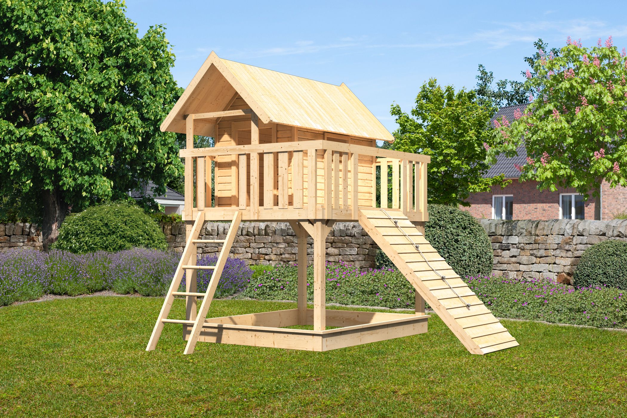 Dieses Stelzenhaus aus 19 mm starken Wandbrettern mit einer Podesthöhe von 150 cm beflügelt die Fantasie Ihrer Kinder. 4 Massivholzpfosten mit einer Stärke von 90 mm x 90 mm und Terrassen vor dem Haus mit Brüstung sorgen für viel Sicherheit für Ihre Kleinen. Im Lieferumfang ist eine Holzleiter enthalten, die den Zugang zur Terrasse vereinfacht. Das Außenmaß dieses Hauses beträgt 198 cm x 243 cm x 329,5 cm und bietet somit unglaublich viel Platz um die Fantasie anzukurbeln. Das Haus wird mit einem Satteldach aus Massivholz geschützt. Die 5,9 m² große Dachfläche bietet auch der Terrasse noch Schutz und sorgt für unbeschwertes Spielvergnügen, egal zu welcher Jahreszeit. Unsere Stelzenhäuser bieten mit einer 300 cm langen Rutsche in vielen Farben sowie weiterem umfangreichem Zubehör alles, was das Kinderherz begehrt.