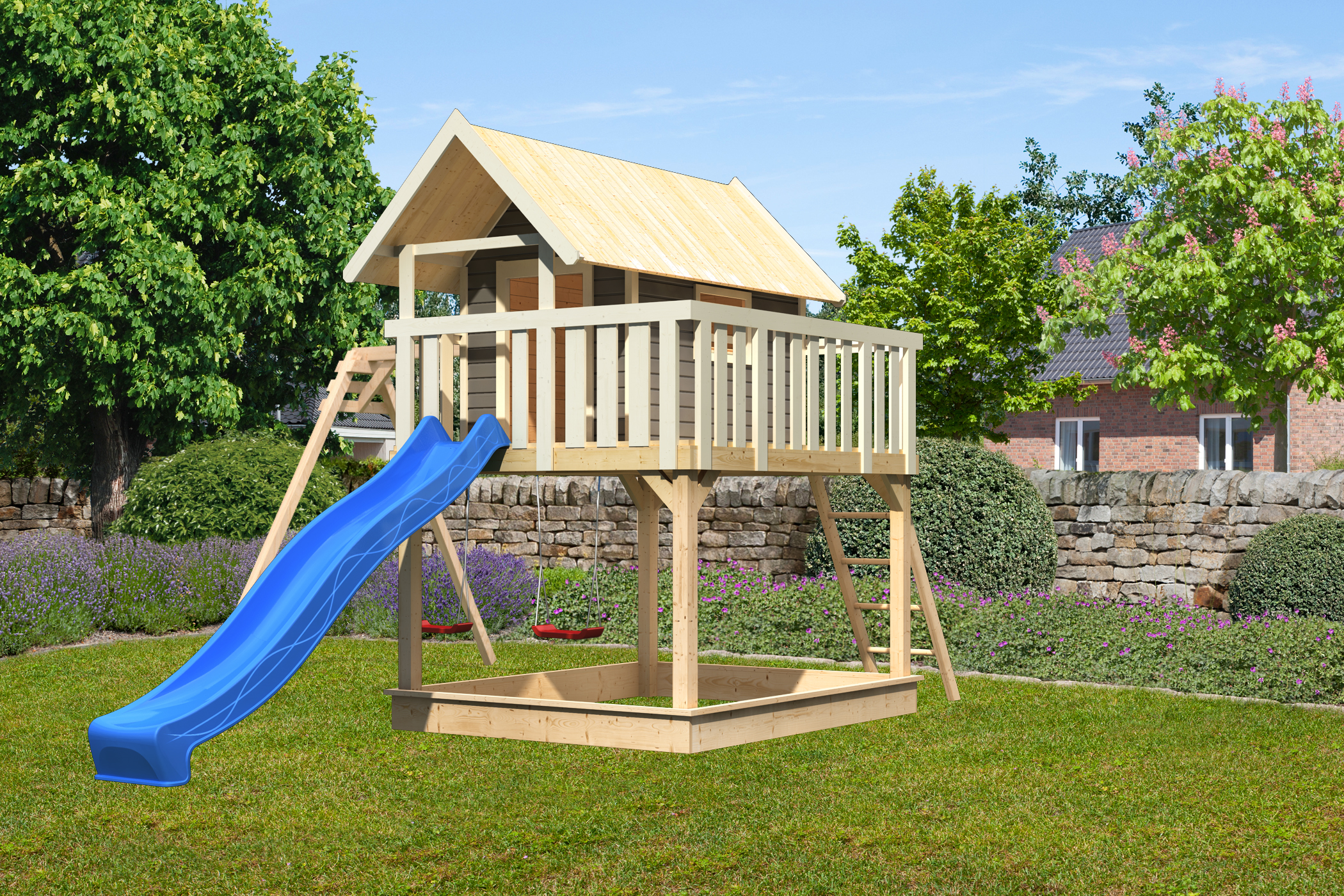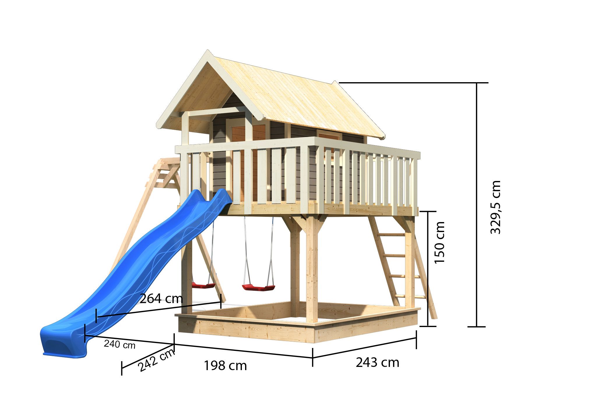 Dieses Stelzenhaus aus 19 mm starken Wandbrettern mit einer Podesthöhe von 150 cm beflügelt die Fantasie Ihrer Kinder. 4 Massivholzpfosten mit einer Stärke von 90 mm x 90 mm und Terrassen vor dem Haus mit Brüstung sorgen für viel Sicherheit für Ihre Kleinen. Im Lieferumfang ist eine Holzleiter enthalten, die den Zugang zur Terrasse vereinfacht. Das Außenmaß dieses Hauses beträgt 198 cm x 243 cm x 329,5 cm und bietet somit unglaublich viel Platz um die Fantasie anzukurbeln. Das Haus wird mit einem Satteldach aus Massivholz geschützt. Die 5,9 m² große Dachfläche bietet auch der Terrasse noch Schutz und sorgt für unbeschwertes Spielvergnügen, egal zu welcher Jahreszeit. Unsere Stelzenhäuser bieten mit einer 300 cm langen Rutsche in vielen Farben sowie weiterem umfangreichem Zubehör alles, was das Kinderherz begehrt.